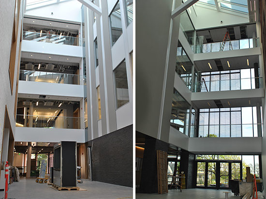 Between the lab suites on all the levels, a shared living room looks onto the atrium providing natural light and helps orient occupants within the building.