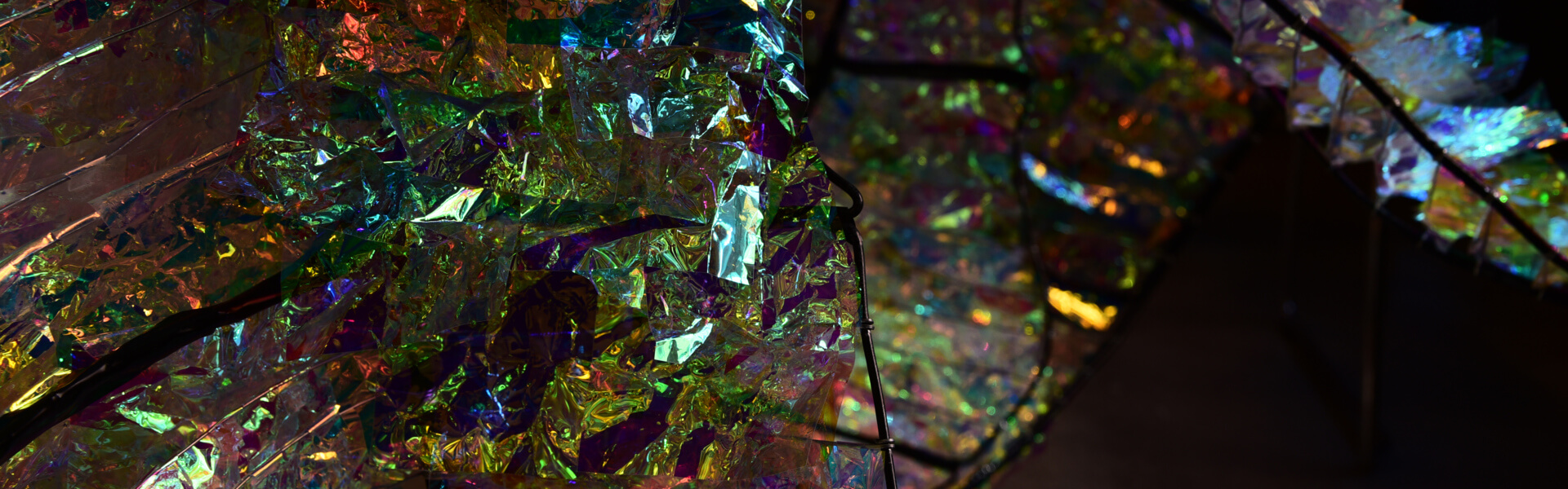 With the theme of “Reflection”, we created the the “Trichroic Mien” (which can be translated as emotional expression in three colors) explored how fashion reflects our emotions and personality. The little black dress, a fashion staple, was deconstructed and reimagined using color in different ways to represent hidden, controlled and wild emotional expression. Polarized, rainbow-hued dichroic film, typically an interlayer in laminated glass is featured throughout the pieces.