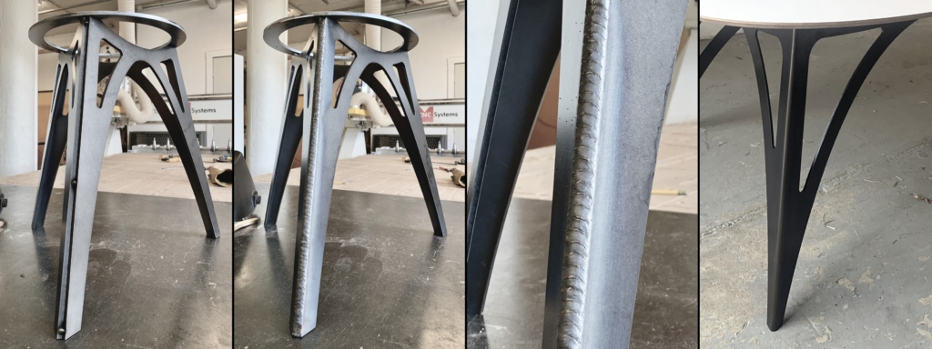 We don’t usually run large welds, but this furniture has long, fully welded seams at the corners of the legs on the stools and table. From left to right, this image sequence shows the tack-welded fit-up, the fully welded seam, a close-up of the ½’ single-pass bead, and the ground and blackened final condition. We ground all the legs smooth to accentuate the geometry rather than the process, but we left one stool unground as a discussion point and visual reference for the studio.