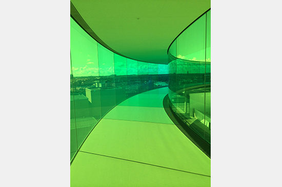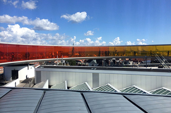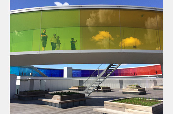In Aarhus, I experienced Your rainbow panorama, which is a permanent work consisting of a circular glass walkway spanning the colors of the spectrum. The panorama ‘floats’ on the roof of the Aros art museum with a recreational / viewing platform below, allowing visitors to experience the rainbow panorama from below as well. Visitors are allowed to access the panorama and walk the circle with views to the city below. While I was there a group of students were tasked with identifying key buildings in the city and the color through which you could view them. Other visitors where methodically documenting the slices of color with their cameras. I love viewing cities from above because I gain a sense of the consistency (or lack thereof) of the overall architecture, roof lines and materials. Your rainbow panorama afforded me that experience without the stomach-drop feeling I usually have when I climb to the top of a church steeple (which I did do in Copenhagen).