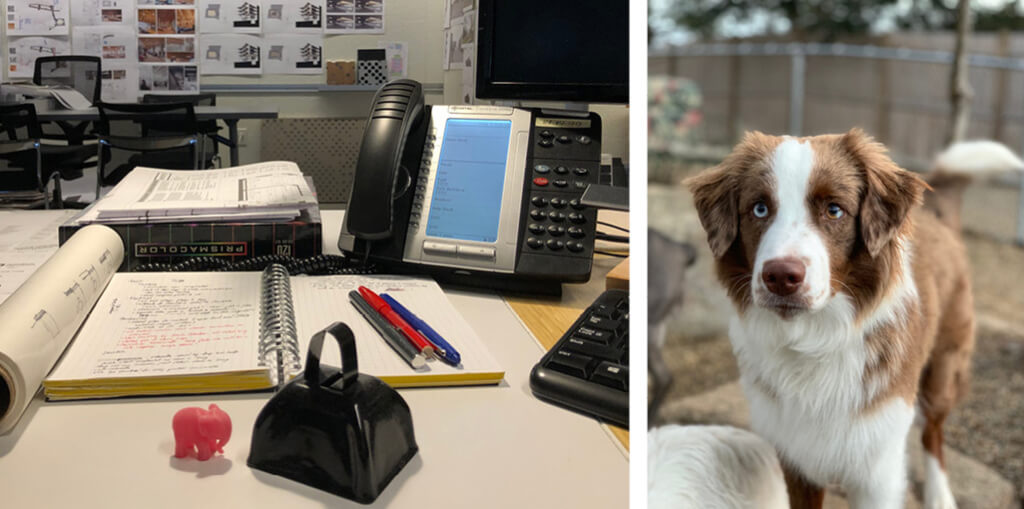 Other items on Megan’s desk include a small pink elephant, a gift from her nine-year-old niece, and a cow bell. The cow bell was passed down to Megan from a former YDC chair and was used at past YDC events. The elephant was 3D printed by her niece. Megan explained that her niece is taking coding classes in school and has a 3D printer at home she loves to use. A fabricator in the making or perhaps she will follow in the footsteps of her aunt and become an architect?