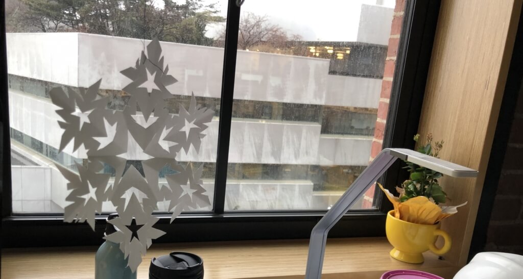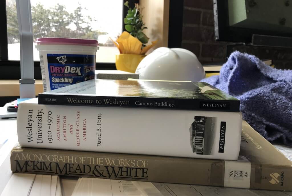 My next stop was to Ngaire’s work station. Her desk held a mix of things related to her work on Wesleyan University’s new Molecular and Life Sciences building, and a paper cut snowflake hung from her lamp. The snowflake was a remnant from the YDC’s recent winter holiday party. The other items laying on her desk would seem to be an odd combination to anyone but an architect. A container of spackle was nestled among a stack of books and a hardhat. The books on her desk are sources for research on Wesleyan’s campus architecture and include a McKim Mead and White monograph. The spackle is for quick patches and changes to a site model created to explore massing and concept iterations for the Wesleyan University project. The building will be the new home for Biology, Chemistry and Molecular Biology departments at Wesleyan and is currently in the programming and concept phase.
