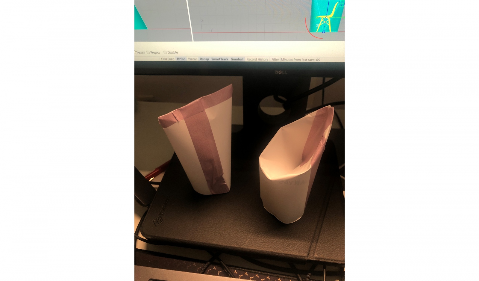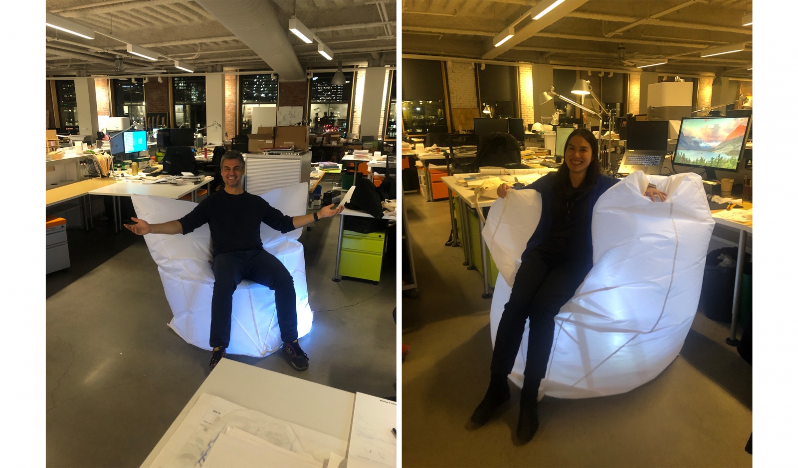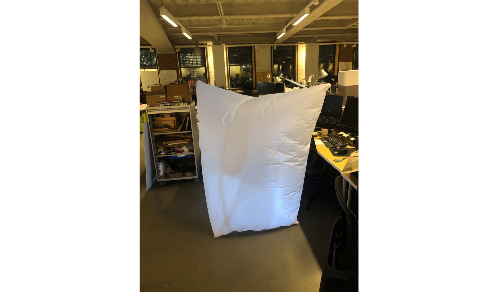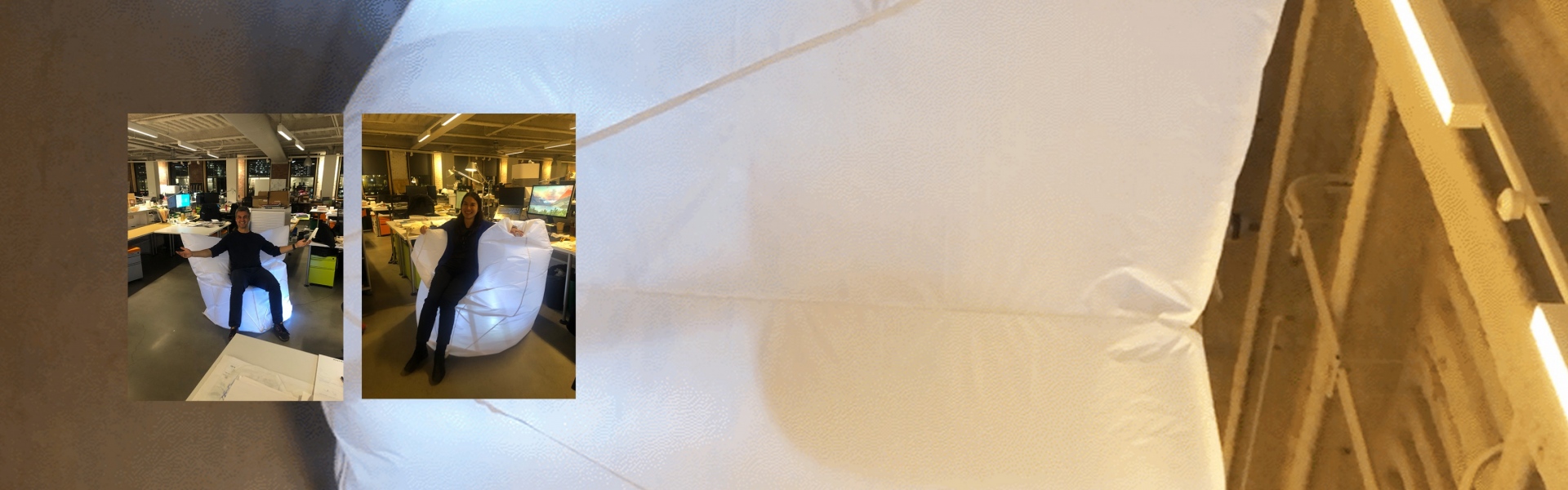 Now, PAYETTE people can spot a gigantic, inflated object emerging in the team’s area of the office. In a shape reminiscent of a toothpaste tube, the object is made of airtight nylon fabric, and people don’t fully know what it is until they are encouraged to sit on it. While they may think they are risking their lives, they find themselves being caught by a chair inside the object. The feeling of sinking into the chair and being embraced by the cloud-like object is so marvelous that people don’t want to stand up again. When they eventually get up, the chair is quickly re-inflated by two fans we cut out from one of the ever-present inflatable holiday decorations found on people’s lawns. Over the last few weeks, we have gathered a lot of feedback and ideas, and we have some major improvements in mind to bring our game to the next level.