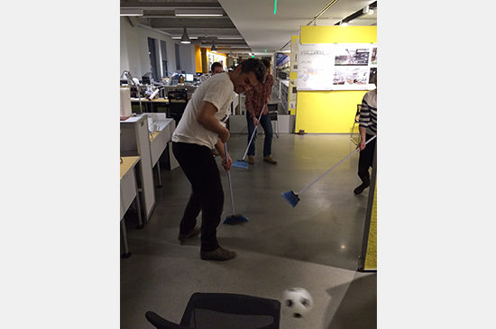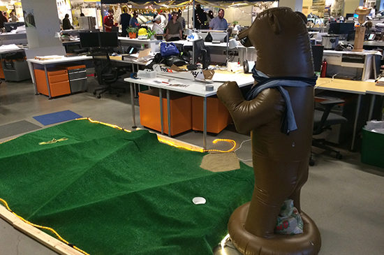 The next group found inspiration in the movie Caddyshack, as well as the aisles provided by our desk set-up and constructed a mini golf course. The first hole was modeled after our winning design for the Fifth XiangYa Hospital, and another featured a life-sized bear flanked by a couple of sand traps. A small, singing and dancing robotic gopher was there to encourage, and golfers were encouraged to snack on Doritos and Cheese Balls.