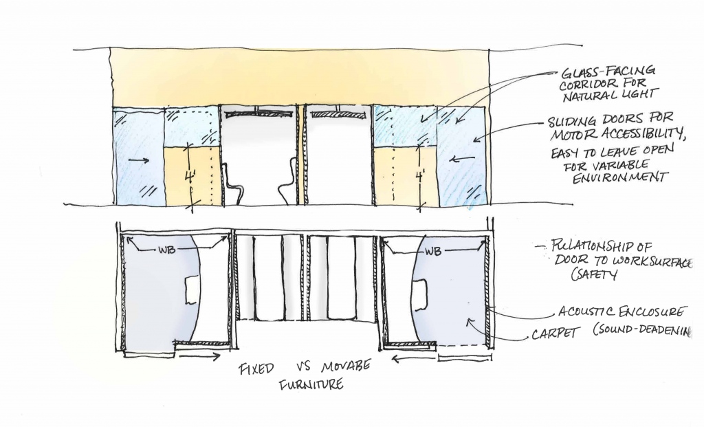 We addressed the expressed desire for privacy and reduced sensory input by splitting the existing small conference spaces (Space 2) into areas more appropriately sized for individuals. Two desk carrels provide workstations away from the main office floor and provide a cocoon for those needing reduced sensory input. Sliding doors located off the corridor provide a more private entry to the carrels, while clerestory windows provide some natural light without violating the need for visual privacy.