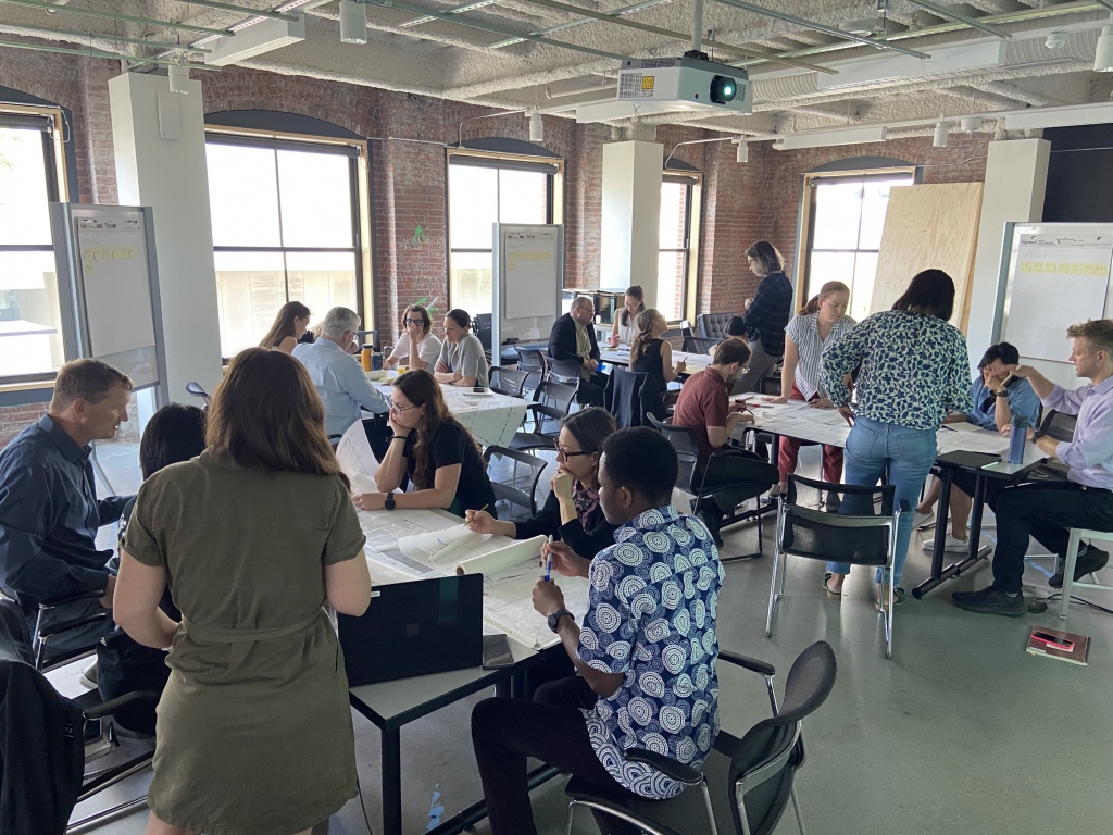 A photograph capturing various groups of people drawing, talking, and brainstorming around tables with laptops, trace paper and markers.