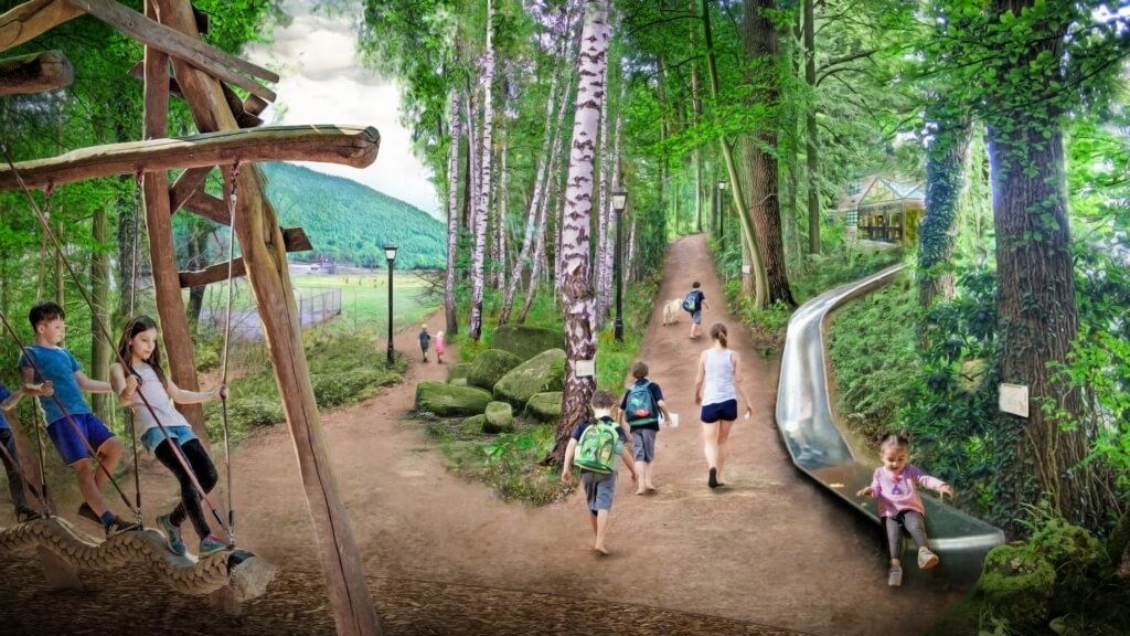 The project team developed a plan to extend the existing path to create a ‘linear park’ that engages students in learning opportunities as they walk to and from school. As they enter Braytonville Park, students will find a playground connected to a winding ramp. Students can either weave through the different spaces along the ramp or take a direct route up a central stair that connects the park to the school entrance. As they pass by various species of trees and plants and play around locally-sourced boulders, students learn about the local flora, fauna and geology through all their senses. This plan aims to make the path both user-friendly and aesthetically pleasing to provide a safe route for students to go to and from school and the YMCA on foot.