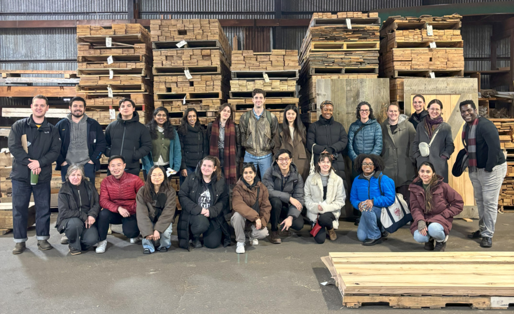 We kicked off this year’s Earth Week with a tour of Longleaf Lumber’s showroom and warehouse in Cambridge, MA in collaboration with YDC, our emerging professional’s group, and our circular design research team. Our hosts were incredibly knowledgeable, sharing not only their familiarity with the material and aesthetic options, but with the commercial bidding process and procurement challenges as well. The tour ended with a walk through the showroom so everyone could see and get excited about the range of reclaimed wood products available in our market.