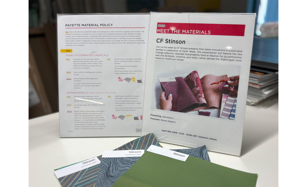 Most every week, PAYETTE welcomes a new vendor into the office and we are proud to screen all products in our Material Library against our Material Policy. For Earth Week, we were excited to welcome CF Stinson and learn more about their line of Red List Free products which have publicly declared ingredients to demonstrate that their products do not contain chemicals of concern. PAYETTE has been a signatory to the AIA Material Pledge since 2019, and our Material Policy plays a key role in guiding our projects to meeting our commitment.