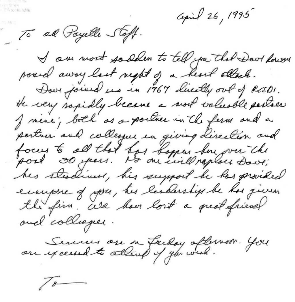 Dave was a kind and gentle person with a quiet wisdom. He was always guiding the firm to do the correct, ethical and appropriate thing in every situation. He set the standard that we all maintain today. He was a true friend to so many individuals in the firm. He embodied an unselfishness and humbleness that seemed to contradict the image of the architect “hero” and he left a profound impact on the firm’s culture. More than two decades after his early passing in 1995, his quiet leadership, collaboration and encouragement are still with us today.