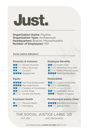 PAYETTE is proud to share we have recently earned the International Living Future Institute’s JUST Label. The JUST Label is a voluntary program that allows an organization to measure and define its commitment to equity and social justice. It compels an organization to take in in-depth and honest look at their operations, at all levels, from employee culture to financial investment, to assess their commitment to social justice and equity in the workplace.
