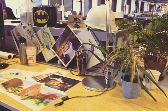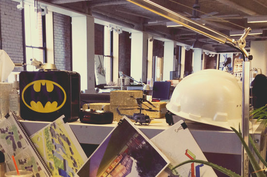 Michael displays his Batman lunchbox (after all, if you are going have a lunchbox, have a great one!), recent project work for easy reference and a few plants. He also keeps a remote control helicopter on display, which he will occasionally fly around the studio on a Friday afternoon. Keeping project work on hand is extremely helpful – it inspires and serves as a quick reference point during discussions. While he enjoys the ambient noise and ability to drop in to different conversations in the open studio, Michael does keep headphones at his desk for the occasions when he needs to work uninterrupted.