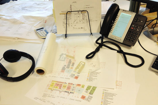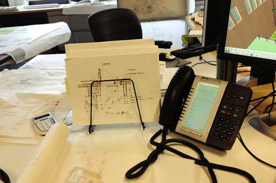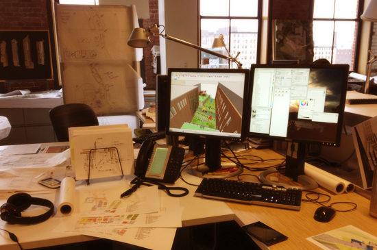 With so many different creative minds under one roof, we all organize our work in a different way. I spoke with Michael Modoono, one of PAYETTE’s designers about his work space. At PAYETTE we have an open plan office with similar table / desk setups for each staff member to facilitate collaboration. We have the ability to make our workstations mobile – moving to a new station should be seamless with rolling filing cabinets (many equipped with cushion tops to make a quick stool) and the same resources available at each station.
