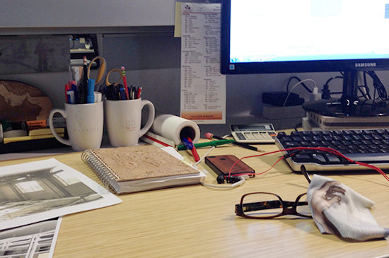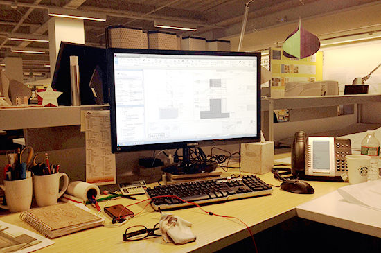 With so many different creative minds under one roof, we all organize our work in a different way. I spoke with Rashad Baniabbasi, one of PAYETTE’s designers about his work space. In addition to his work on PAYETTE projects, Rashad is also responsible for the beautiful portrait photography in our leadership section of the website as well as many of the projects around the office, like the conference room graphics. At PAYETTE we have an open plan office with similar table / desk setups for each staff member to facilitate collaboration. We have the ability to make our workstations mobile – moving to a new station should be seamless with rolling filing cabinets (many equipped with cushion tops to make a quick stool) and the same resources available at each station.