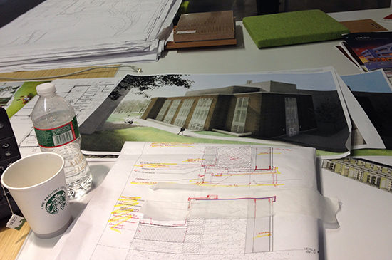 Rashad has worked on a number of different projects, currently he’s occupied with the Construction Documents phase of a project at Cornell University. One of his specialties he brings to his project work is a photo-merging technique he developed that visually combines photography and 3D modeling to provide a raw, unfinished look. This technique hints at possibilities, allowing the discussion to remain open-ended. Rashad keeps an eclectic collection of artifacts on his desk for inspiration; from reminders of home to remnants of models he’s helped build, his desk tells his story. He keeps a small replica of a watercolor he painted next to figurines and a camera miniature. Some of his favorite things to work on are renderings, building models and working out details of a project. When he needs to focus Rashad dons his headphones and plugs in to some of the opera classics, like Puccini.