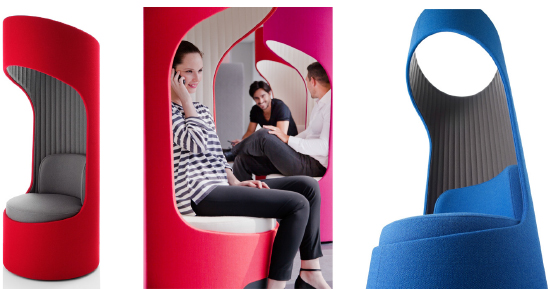Large open spaces are often great for their occupancy and daylighting advantages. But what about those times when the users of the space desire a little less visual or aural stimulation? Small “phone booth” or breakout rooms are one solution. However, these days, many furniture designers are providing us with some great pieces that can supply a bit of shelter for individuals or small groups. These pieces may allow an office or even a large atrium space to maintain its overall openness while simultaneously providing an option for users seeking shelter and focus.