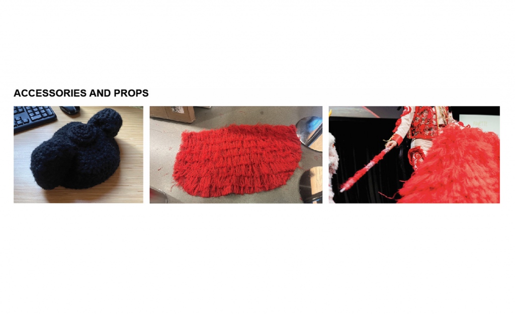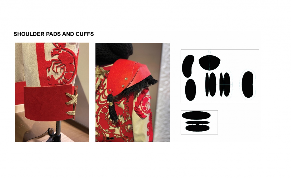 After the pieces were cut, we added some sparkles, tassels and additional patterned cut pieces that could be applied to the costume sleeves. To provide an accent to the leg cut-outs, the team used felt to create a three dimensional edge mimicking lobster tails.