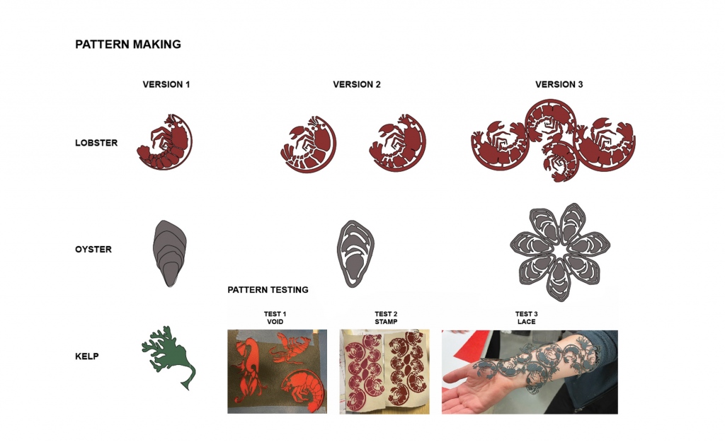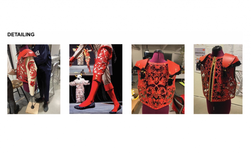 The team embarked on a long journey to reach the final pattern. After designing the first version of the pattern, we test-cut the black leather, and laid the cut piece on top of the red leather. The team was concerned whether the thin lines of black leather could endure the model’s movements when on the runway. Then, we investigated using same method by cutting the pattern but instead painting the void, creating a stamped effect. But, the team felt this solution did not reflect the elegance they were seeking. Finally, we explored a method of connecting each lobster body part, creating a lace effect. When we conducted a test cut of the shape, we knew this was the result we were looking for – it was eccentric, detailed, elegant and reflected our region.