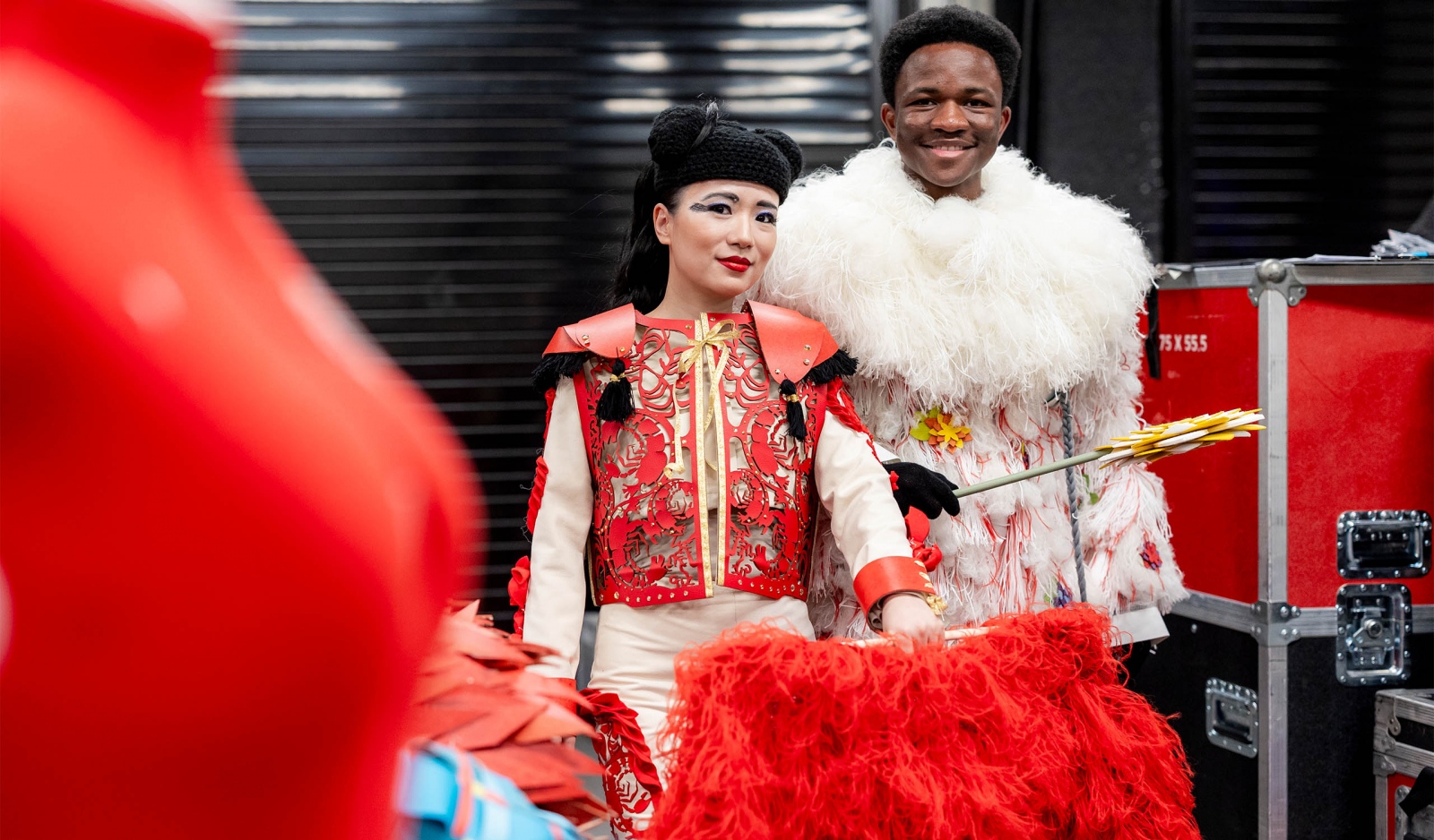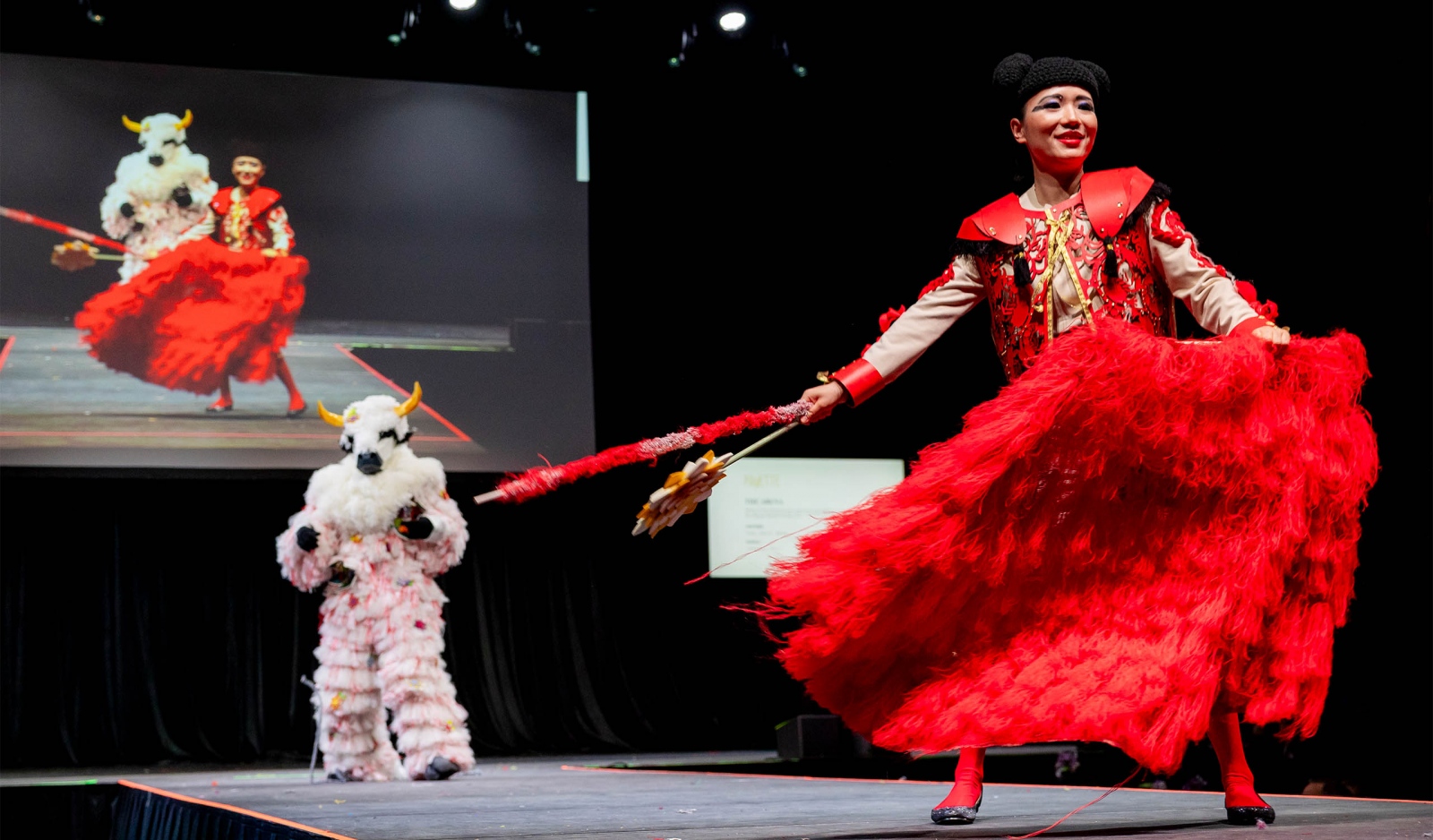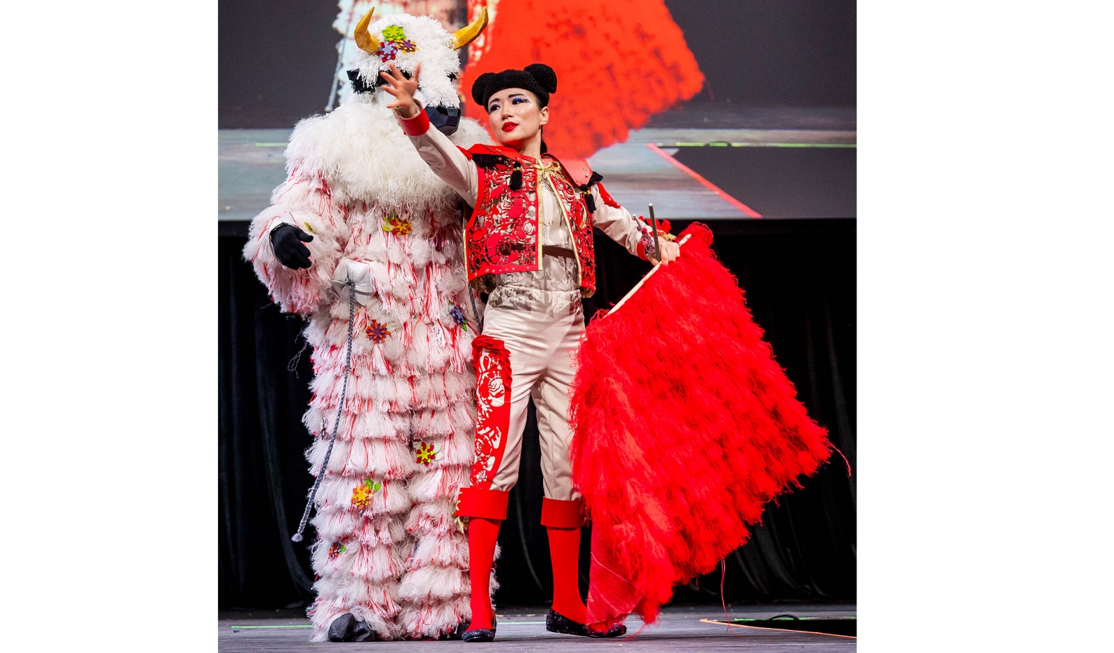 Finally, carpet yarn was used to create the accessories including the hat, spear and cape. The team crocheted the matador’s hat and the cape was made up of hundreds of red tassels handmade by the team. The spear was wrapped with red yarn, tying it in beautifully with the rest of the costume.