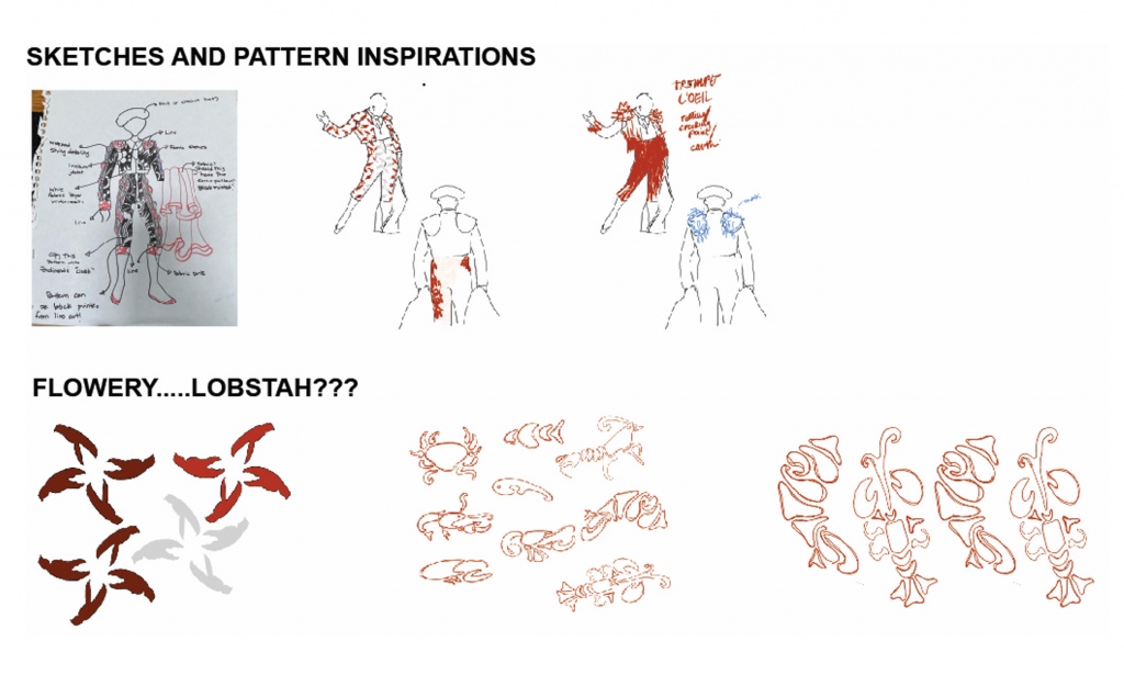 During early brainstorming sessions about the matador costume, we wanted to create something that was an iconic representation of Boston and New England. Most of the team immediately thought about…. “Lobstah” and seafood. Traditionally, Matador costumes are eccentric, detailed and elegant. Using organic lines, the team explored several ways to create elegant seafood patterns.