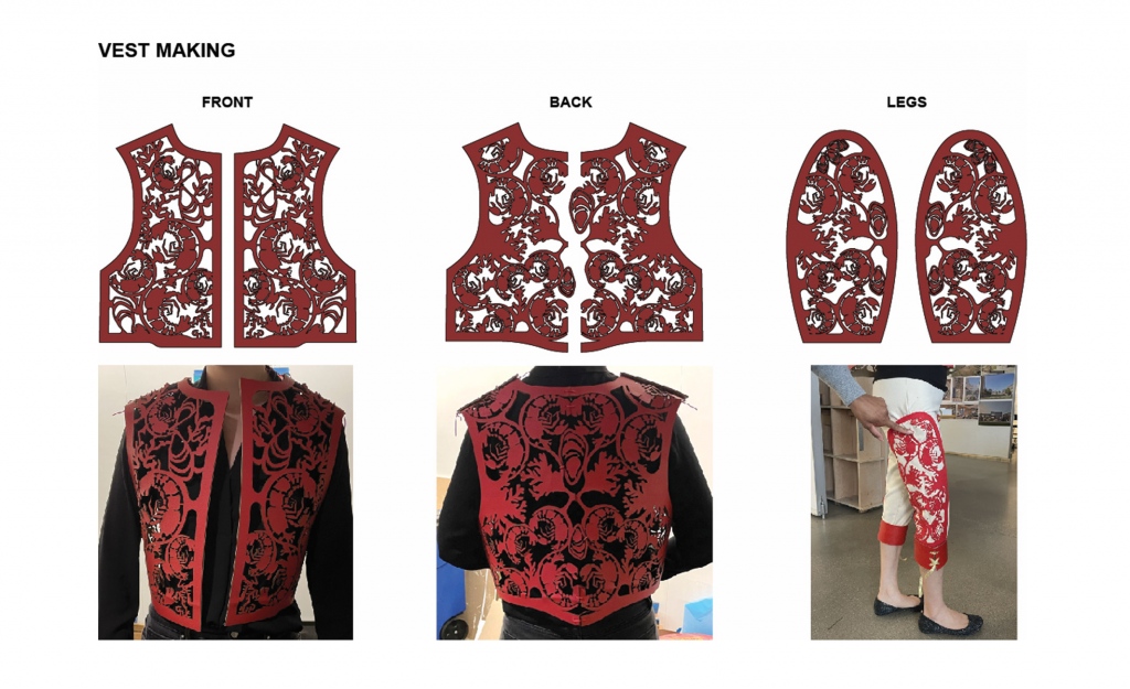 To have stronger constructability for the vest, the team mounted leather on top of chipboard to gain some firmness. The laser cutter’s bed is 18”x32”, so we separated the vest piece into four pieces, then connecting them after they were cut. Keeping those dimensions in mind, the team carefully calculated and designed the pattern in a way that would not create odd shapes or patterns. As for the leg pieces, we used felt because we needed something that was more comfortable and movable than leather. Trusting our several tests cut experiments, we created the vest and leg pieces that would be applied to the matador’s costume.