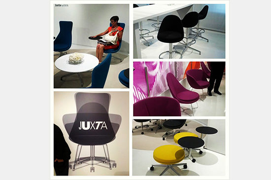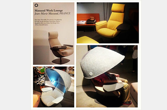 This lounge turned heads at the Coalesse showroom, due to the space-age canopy attached to it. A few items attached to the canopy prototypes included display panels and lights, making it the ultimate place to relax and escape from work or escape to work.