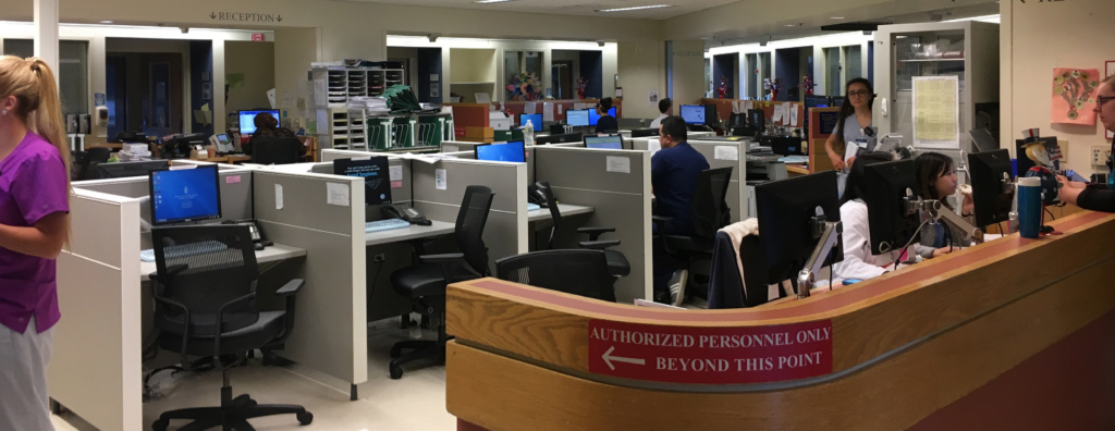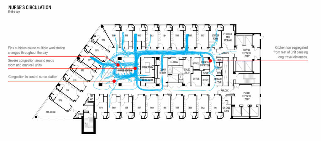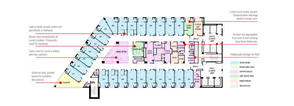 During my time there, I was struck by the intense and stressful environment in which the nurses work. Being on an inpatient floor was a sensory overload; alarms were going off every few minutes from patients getting out of their beds, monitors beeped constantly, and the nurses were on the move all day. There was little natural light in the staff’s main workspace and an overwhelming smell of cleaning chemicals in the air. I asked the nurses how they felt about the working environment and they consistently highlighted the stress of the incessant noise and physical responsiveness required of them. Despite this, the nurses are a dedicated and caring group of individuals. Even in harsh conditions with terminally ill patients, they remain dedicated to providing their patients with exemplary care.
