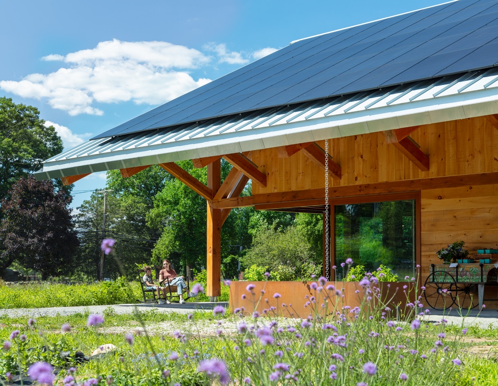 A heavy timber pavilion floating in the landscape; the Farmstand is a place to gather entwined with nature. Capped with an iconic solar array and an ever-changing roof line that embraces the farmstand below, it is enclosed with a wood curtainwall system with sliding glass panels that transform into an open-air structure during the warmer months. Locally sourced timber and handcrafted details permeate the entire structure to provide a radiant materiality throughout.
