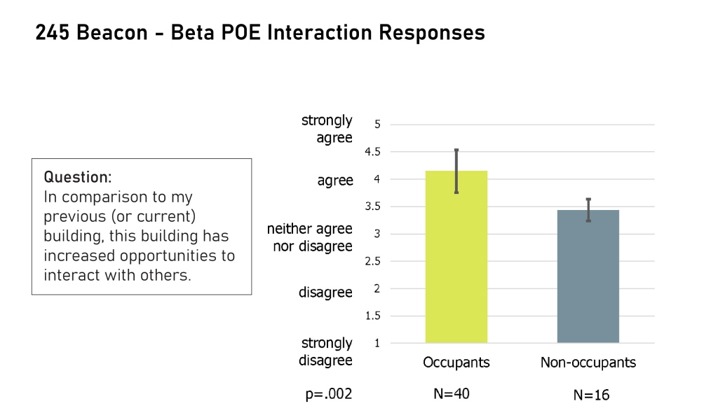 Chart indicates responses by occupants of 245 Beacon and non-occupants. Colored bars indicate mean response with deviation noted in black.