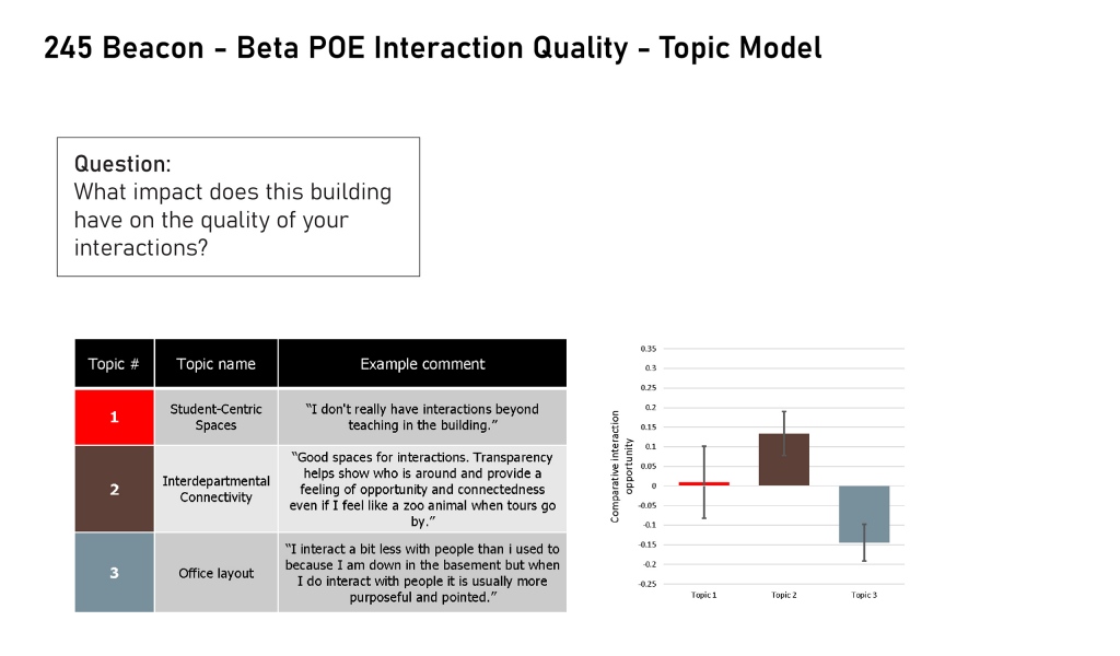 Textual responses were analyzed using structural topic modeling – a quantitative analysis that categorizes words in responses relative to specific topics. While the results of the survey below were not strongly positive or negative, the point is that responses can be categorized into topics and then measured.