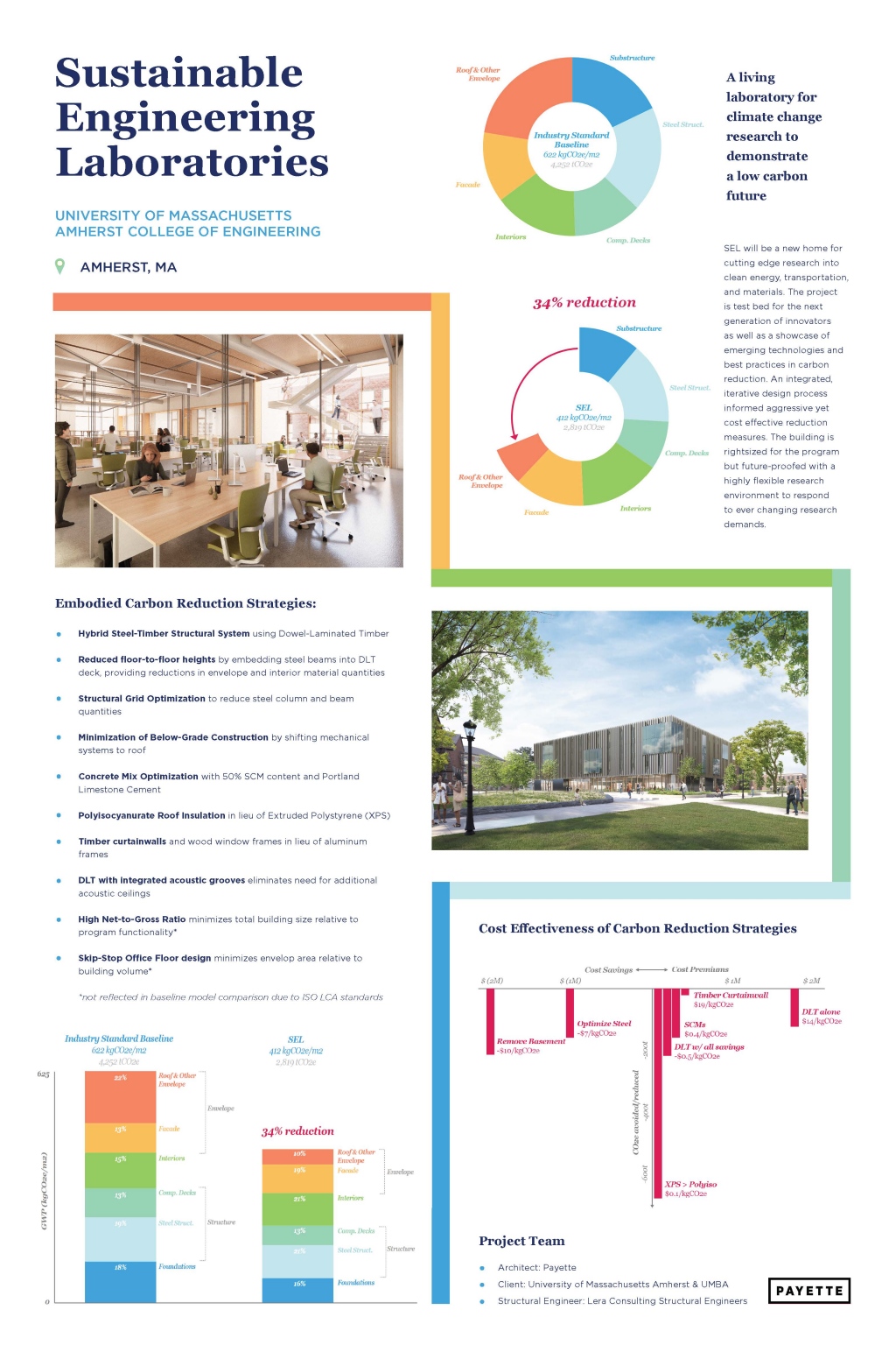 Congratulations to the University of Massachusetts Amherst Sustainable Engineering Laboratories project team on earning the grand prize at the Embodied Carbon Challenge sponsored by MassCEC and Built Environments Plus. The winning submission included the extensive sustainable strategies being pursued by the project to meet the University’s goal for a net zero operational and embodied carbon building.