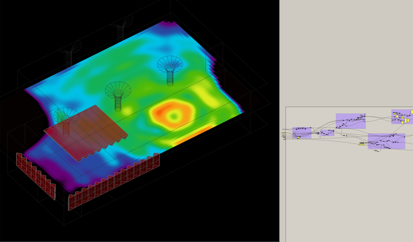 These programs include workflows between Rhino and 3dsMax, Grasshopper and Unity, and exports to several JSON file formats. The group has also created several complex Grasshopper scripts that are used by the designers to automate curtainwall designs, allowing them to automatically apply typical rainscreen systems to facilitate façade design. Often a specific project challenge will prompt the development of a new tool that can be later generalized for use on future projects. The ability to quickly automate repetitive tasks increases efficiency during the design process.