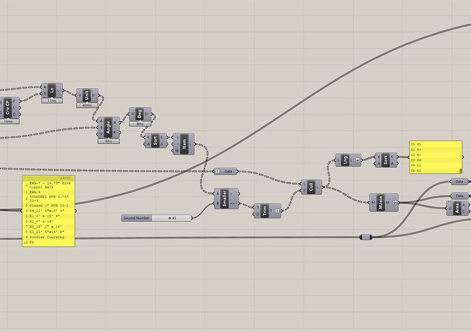 Team members with limited Grasshopper knowledge often gain experience with the tools for a variety of design and automation tasks. One example is the Northeastern EXP façade fins which were developed entirely in Grasshopper. This was implemented as a collaborative script between a small group of designers to enable them to iteratively update the façade design over the course of the project. Another example of parametric design workflow was the design of the UConn façade panelization in Dynamo. For this project, thousands of custom panel patterns were mapped to the facade using a sophisticated culling mask developed by the team.
