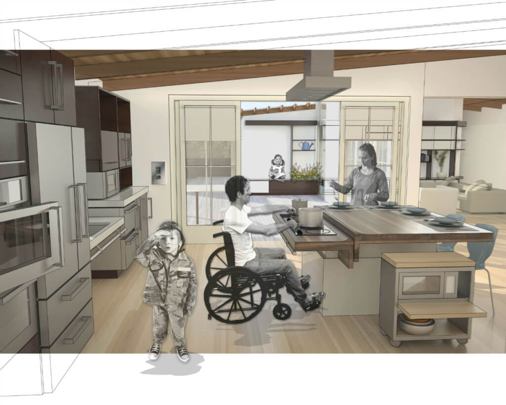 Accessible Military Housing by Michael Graves and IDEO is specifically designed for service members with disabilities and their families. The houses have lowered work surfaces, grab bars and handrails, and wide doorways which allow someone using a wheelchair or mobility aids to live comfortably in their home and have more independence. These homes also address cognitive concerns associated with security, where lowered windowsills and side lights provide ample lines of site for all occupants.