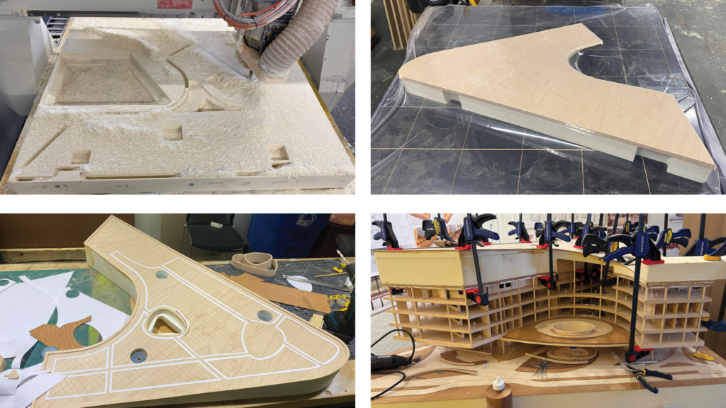 The sculpted roof capping the model presented its unique host of challenges. This doubly-curved element was flip milled on our cnc router from high density foam for weight-saving and tolerance considerations. However, after it was veneered in our vacuum bag, the shrinkage of the wood fibers in the veneer began exerting force on the piece, causing listing and deformation at the extremities. This effect could pose serious problems years down the line, as extreme as ripping the roof completely off of the floorplate below. This tension was relieved by scoring the veneer orthogonal to the grain. To attach the roof to the rest of the model, 2″ pockets were drilled into it and washers were inserted where the threaded rods terminated. When tightened, the whole model was brought into alignment. This mechanical connection further removed the possibility of failure caused by long-term expansion and contraction cycles that could be limiting for traditional adhesives. The scored and marked roof sections were all then covered by the roof garden veneered elements.