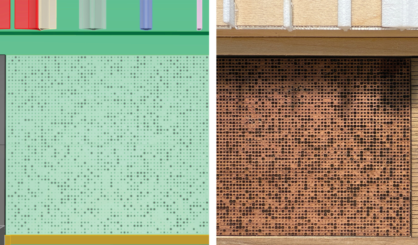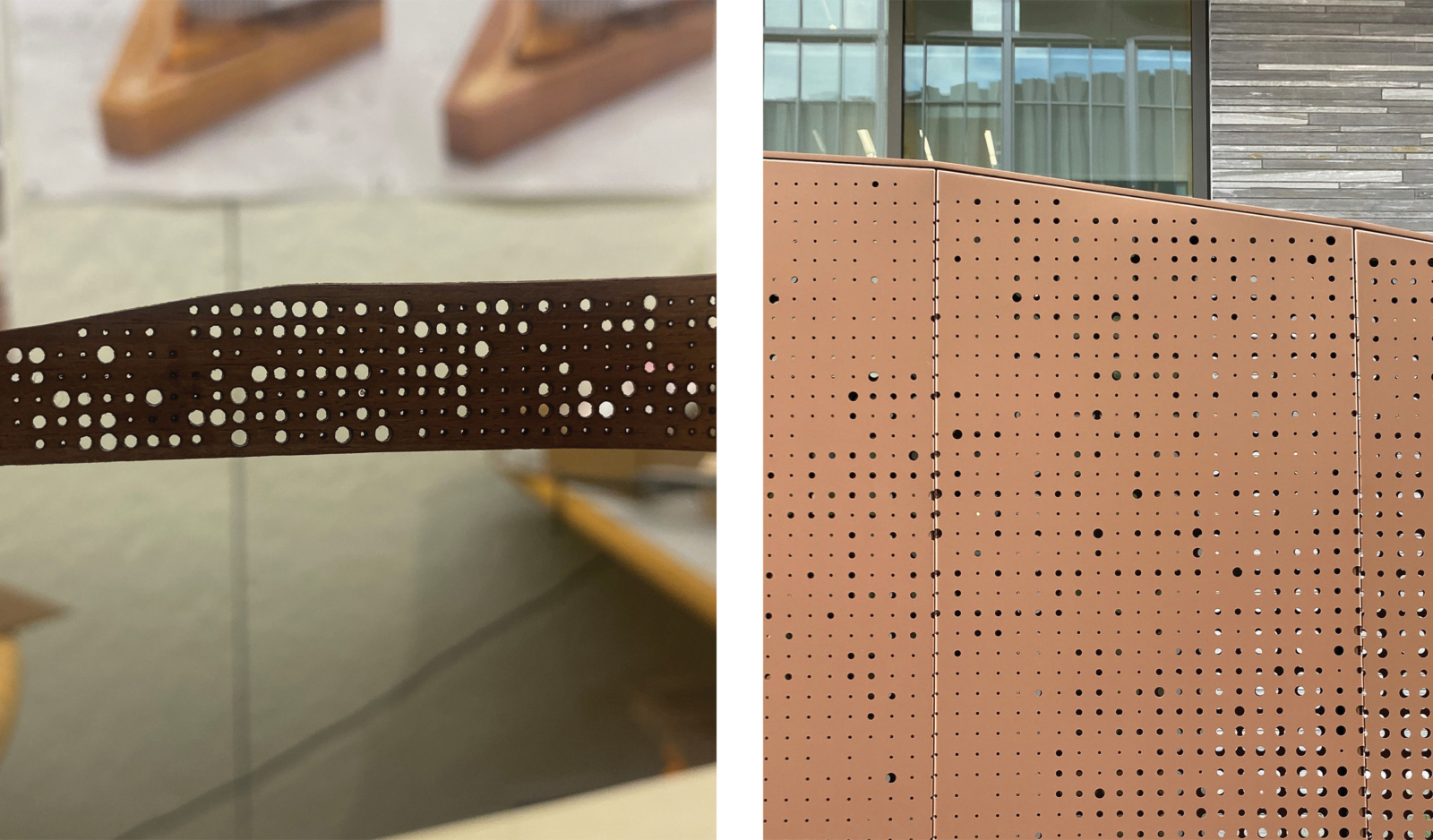 Variable patterning of the perforated façade communicates a fun and playful dance on the tactile surface, contrasting the smooth staccato from the fins above. Not exclusively for design aesthetics either, the perforations serve a practical function in that they disguise noticeable seams, sublimating the panel gaps and additional components of assembly. Redwood veneer was chosen to preserve the visual essence and compliment the walnut “stone” and white fins, much like the Corten and aluminum do for their real-world counterparts.