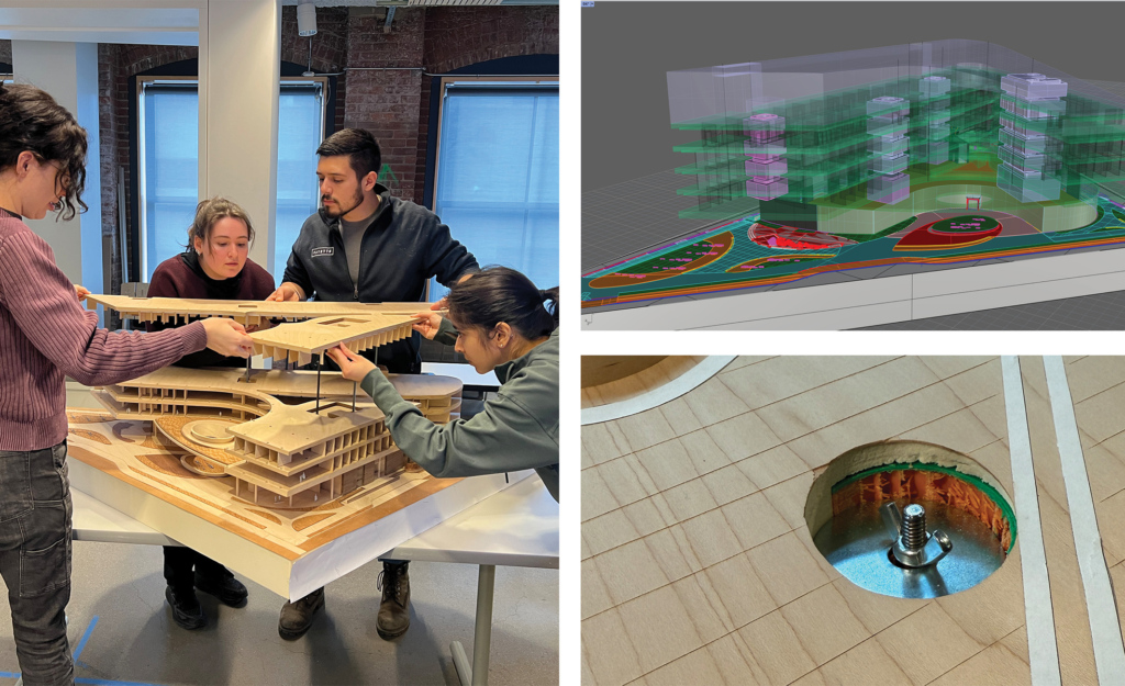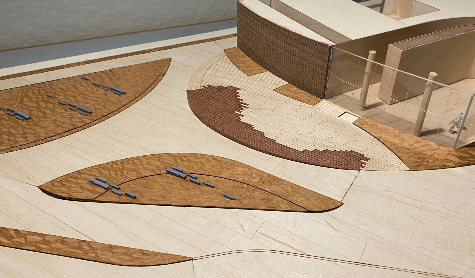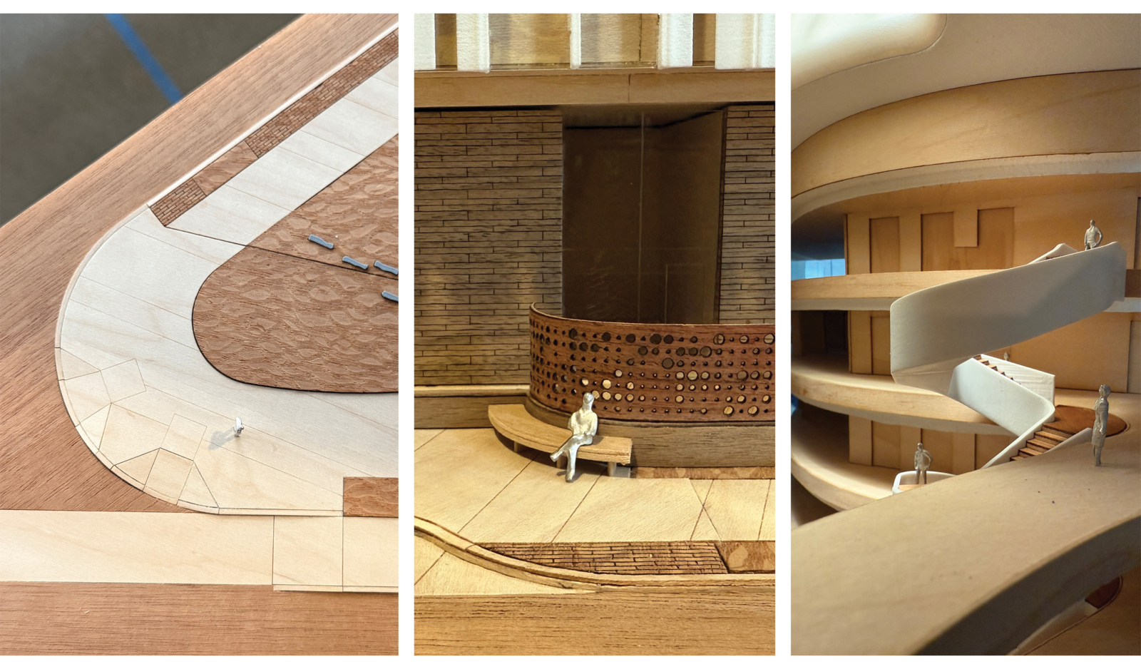 We paid special attention to detail when finishing all aspects of the model, meticulously sanding veneer to fit the many unique conditions all the way down to the curb cuts on the sidewalks and the 3D printed stones embedded in the landscape. The integrated scale figures further serve to further highlight the human elements of the architecture and fundamental purpose of good design.