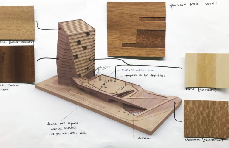 Alongside the structural implications and associated myriad of iterative solutions, consideration of design and vernacular for the model was a persistent topic of discussion. The journey of abstraction for the exhibition model is a story of many unique design choices, some informed by existing architectural icons, some the product of the fusion of performance and design, and still others inspired by our own past work.
