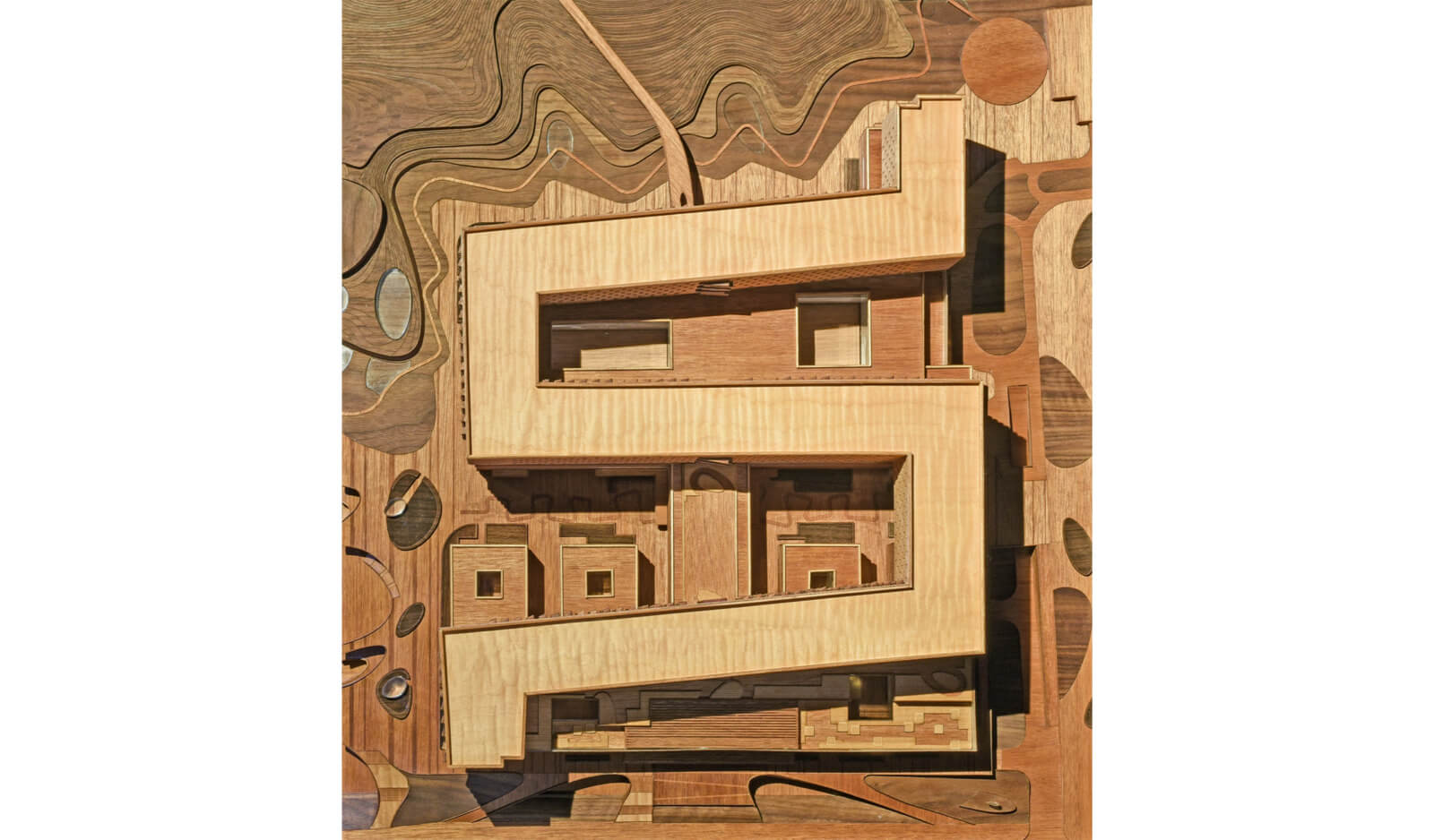 The mountain was fabricated by stacking sheets of veneers leading to a graphic representation of the landscape. Mounted with internal pieces acting as supports and guides.