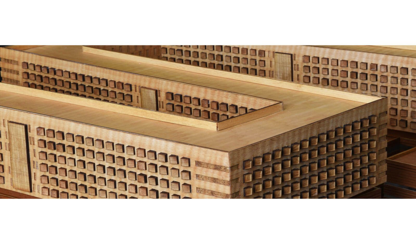 Recreated at 1/32”=1’ scale, the patient room windows were made from a piece of wood, firstly angled on a belt sander and subsequently laser cut. The hundreds of pieces were then nested on the façades and glued on the building as panels. For a better sense of the project’s scale, take a look at the full-size mock-up previously made by PAYETTE’s fabrication team.