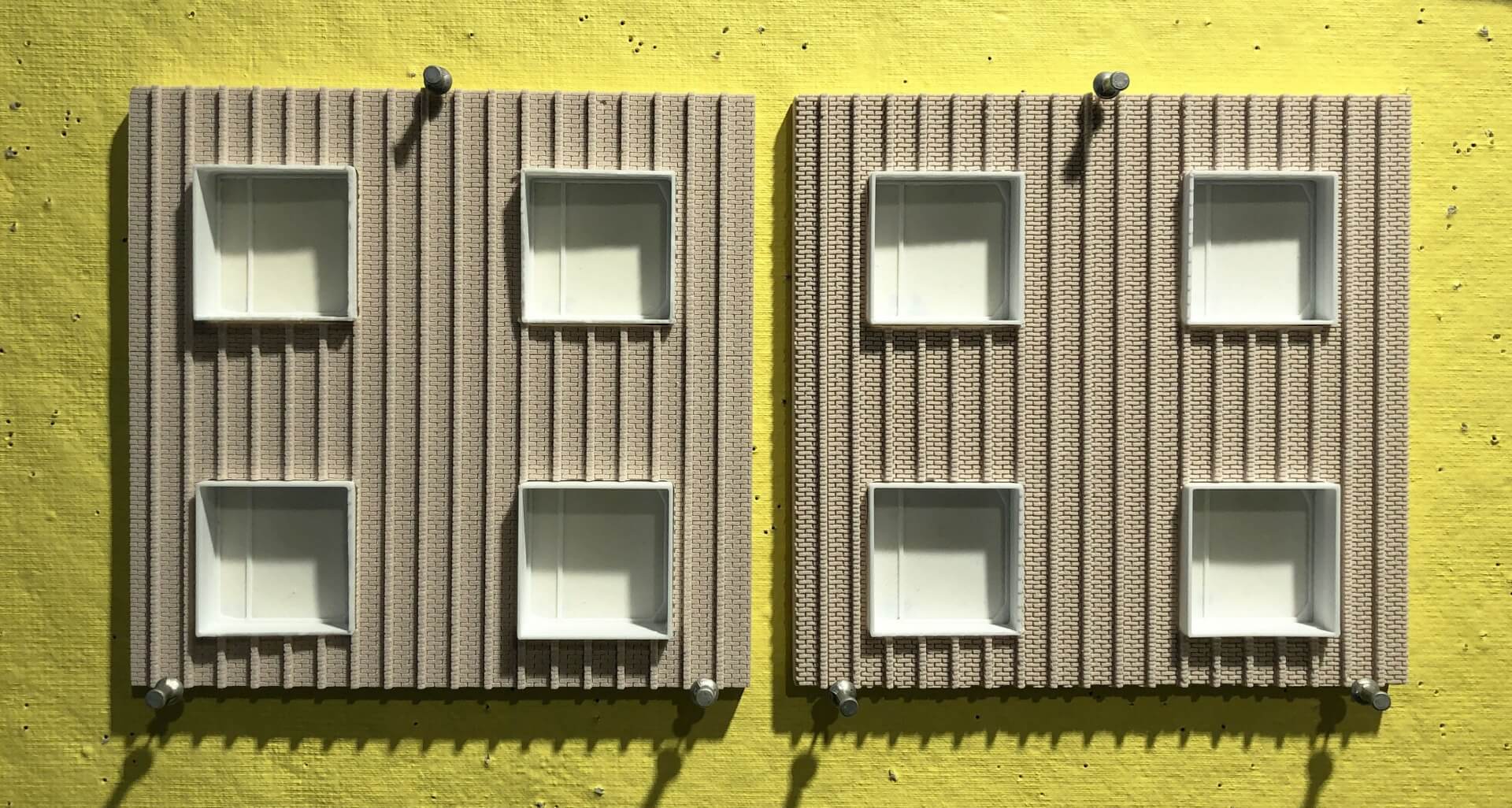 In further detail we produced a series of smaller models with the engraving of mortar lines. At this stage we also began exploring metal shroud options. 3D printed inserts of shrouds with various depths and shapes to allowed us to consider how shadows would interact with the façade.