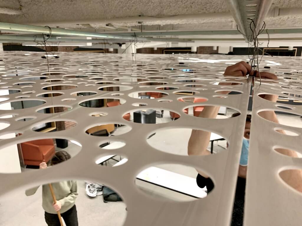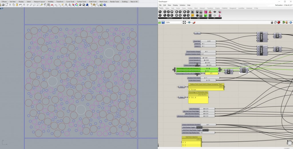 In rationalizing the perforation patterns, the team reduced the number of large four-inch diameter openings to three per panel on a one-foot square grid. Light fixtures will shine through these large openings, while the rest of the panel will be populated with a field of randomized, smaller openings. Our Design Visualization team devised a parametric grasshopper script, allowing the design team to rapidly churn out iterations of perforation patterns with different sizes and densities of holes. A massively useful tool when fine tuning the opening percentages of the design to achieve the desired visual effect, prevent structural warping of the panels and ensure the effective functioning of the acoustical insulation installed in the ceiling.