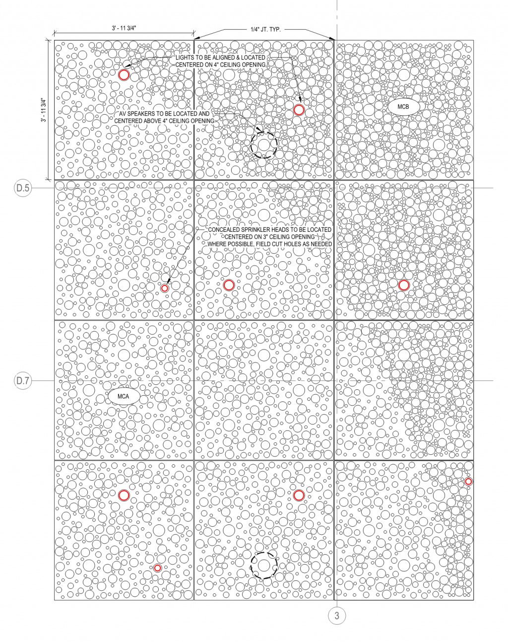 With the new metal panel material palette, the team remained diligent in being faithful to the original design intent in creating the figure ground pattern on the ceiling. But instead of creating two different layers at different elevations as was obvious for the wood ceiling, the two zones are now being achieved by varying the opacities of the four-foot square panels from which circular apertures are cut.