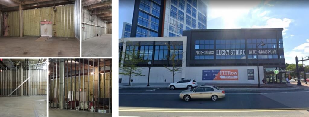 I started the presentation with an introduction to the project site at Assembly Row, which is a mixed-use development with housing, restaurants and shops The 8,000 square foot imaging clinic will be constructed in a tenant space at the base of the Mass General Brigham tower. An added challenge to the project is the fact that the space is located directly below the Lucky Strike bowling alley and arcade, and TITLE boxing gym. The noise and vibration from these two tenants are less than ideal for MRI machines, but the design of fully considers these issues. The existing space is a shelled interior with twenty-foot high floor to floor dimensions. I have worked on many renovation projects and this floor to ceiling height coupled with the fact that almost everything in the space was exposed, were welcome conditions to start with.