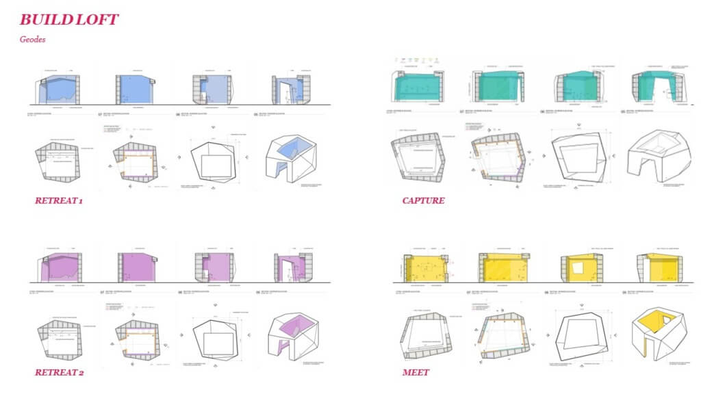 As its name suggests, the concept of the Geodes comes from the spherical rocks with an internal cavity lined with color mineral materials. The overall building material palette is dominated by different types of natural wood, so the use of colors is carefully curated as a “decoration.” The materiality of the Geodes echoes the color strategy, homogenous from the outside, with the interior of each Geode in a different pop-up color, made out of painted cork tiles and fabric wrapped panels.