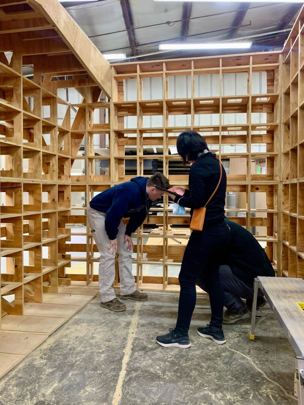 The mock-up was a trial fitting to test the geometry, showing the fabricators’ ability to achieve the design. They developed a complete skeleton structure for the Geode, 10′ x 15’x 8′, large enough for people to walk inside and experience the space. This visit allowed the team to see the craftsmanship and corner conditions of the skeletons and have an interactive conversation about the design intent.