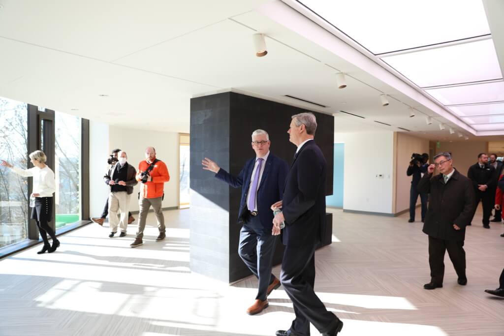 Kevin, the Principal-in-Charge for the project, led the Governor through one of the resident homes, talking about the organization of a typical unit that surrounds each kitchenette. He discussed some of the key features, such as the circadian ‘skylight’ in the dining area, the fireplace, nurses’ stations and the amazing panoramic views. Both Secretary Sudders and the Governor were very impressed with the Resident Rooms – from the way the team was able to conceal medical devices in the headwall, to their size, quality of light and views, use of natural wood and even the flooring. The building was noted as ‘iconic’ in a few different speeches and after the tour everyone could really feel how special this building is and how meaningful of a difference it will make for the staff and Veterans at the Soldiers’ Home.