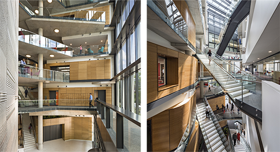 The atrium integrates the administrative and teaching halves of the building. This enables office workspaces that are deep within the building’s core to receive natural daylight, which falls from a skylight opening in the penthouse level to the basement floor eight stories below. The extensive use of glass walls and open galleries around the atrium openings affords an array of views across, down and up through the different floor levels, which are connected by an open stairway that zigzags its way through the building.