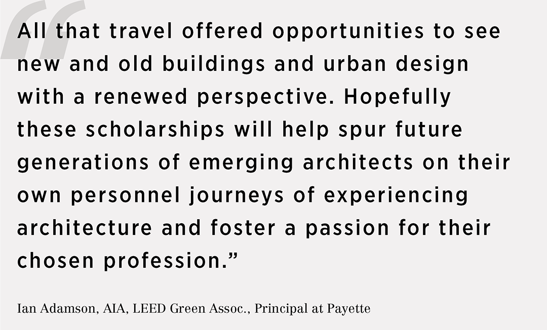 After many years of supporting the Department of Architecture with annual gifts through PAYETTE, Ian and Faith, Ian’s wife, have decided to personally endow a scholarship for students traveling board in their fourth year of study. Both Ian and Faith believe that travelling, seeing architecture and experiencing different cultures rounds out an architectural education and helps one develop a more universal view of life. Additionally, as the cost of a college education increases, Ian and Faith wanted to create the opportunity to assist young students afford this experience without additional financial burden.