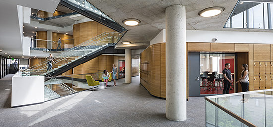 George Washington University’s Milken Institute School of Public Health, located in the nation’s capital, design embodies well-being. Built around an atrium that admits light and air, the structure encourages physical activity with a staircase that spans its eight levels. A green roof reduces storm runoff; rainwater is collected and stored for plumbing, resulting in a 41 percent reduction in toilet fixtures’ water use. Limestone panels were salvaged from the previous building on the site. Materials used throughout the building contain recycled content.